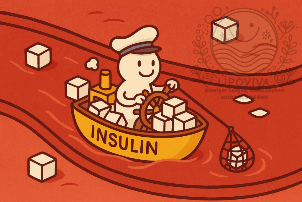 Dein Körper reagiert darauf mit Insulin. Dieses Hormon fährt wie ein kleines Boot durch die Blutbahn und sammelt den Zucker ein, der jetzt im Blut herumschwimmt.